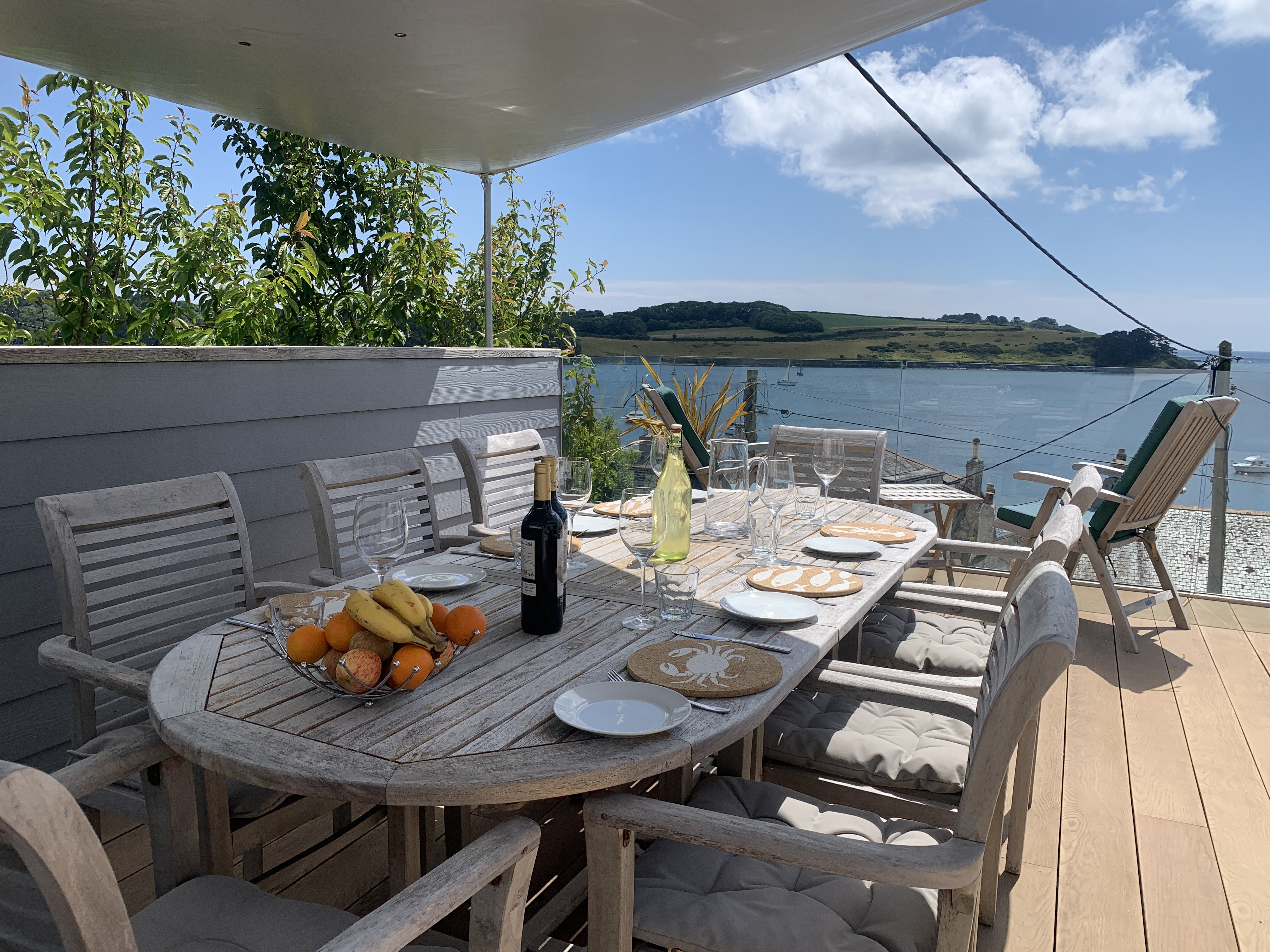 Outside sun deck and dining area: This is accessed from the kitchen/living area or the front driveway. The dining area seats 8. There are also 2 sun loungers, 2 steamers and a garden bench.